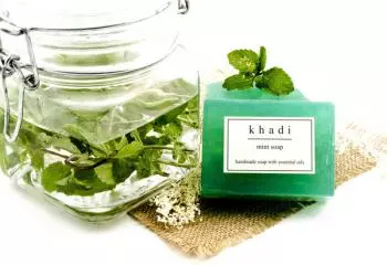 Індійське мило ручної роботи Khadi М'ята виготовляється тільки з натуральних рослинних компонентів з додаванням натуральних екстрактів та ефірних олій. Мило Khadi виробляється виключно вручну. Мило ручної роботи М'ята Кхаді з натуральною ефірною олією м'яти має сильний антисептичний ефект, але при цьому м'яко та дбайливо впливає на шкіру. Має охолодний і протизапальний ефект. Воно зберігає шкіру прохолодною навіть після освіжаючого душу. Підходить для жирної та комбінованої шкіри.